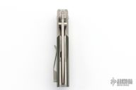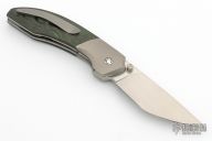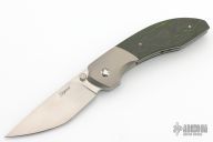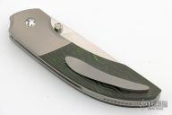 This Linerlock by Stephane Sagric features a hand rub satin finish Tanto blade with dual thumbstuds and notched thumbramp. The handle has titanium bolsters, green carbon fiber scales with titanium liners, matching backbar and tip up clip. Rides on bearings, nice detent, lockup and blade seating. Comes with leather case, patch, and coin. New from Maker!