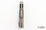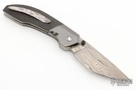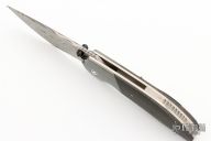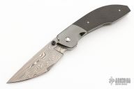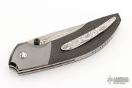 This Linerlock by Stephane Sagric features a Damascus Tanto blade with dual thumbstuds and notched thumbramp. The handle has Zirconium bolsters, carbon fiber scales with titanium liners, matching backbar and tip up clip. Rides on bearings, nice detent, lockup and blade seating. Comes with leather case, patch, and coin. New from Maker!