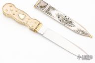 This California Dagger by Steven J Rapp features a hand rub satin finished blade with 1" sharpened top edge, .186" blade stock and .972" blade depth, hidden tang construction. The handle has an 18k gold guard, frame and accents with fossil walrus ivory inlays. The handle and scabbard are adorned with tons of gold inlays and beautiful engraving done by Julie Warenski. Comes with a matching sterling silver scabbard with gold quartz belt stud. Excellent condition. Comes with a zippered case.
