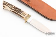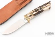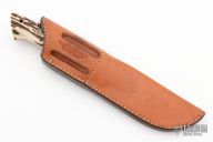 This Big 7 by Jimmy Lile (no dot) features a satin finish blade with .182" blade thickness and 1.011" blade depth, full tapered tang construction. The handle has an engraved brass guard and pins, stag scales and red liners. Includes a Jimmy Lile brown leather sheath. Engraving done by "JS" (James Stewart). Excellent condition. Comes with a zippered case.