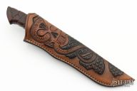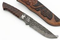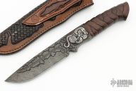 This Knife by Csaba Vojko features a hand forged high contrast carved Damascus blade (K720 tool steel and 75Ni8) with fullers, .176" blade stock and 1.243" blade depth, hidden tang construction. The handle has integral engraved/carved bolsters, and a carved rosewood grip. Comes with a hand tooled brown leather sheath with matching theme. New from maker! As with all his work, this knife is Sole-Authorship and an extremely well crafted work of functional art. Comes with a zippered case.