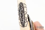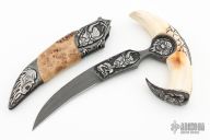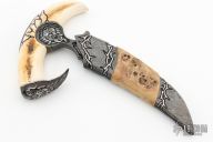 This Push Dagger by Csaba Vojko features a hawkbill Damascus blade with carved/engraved ricasso, .210" blade stock and 1.102" blade depth, hidden tang construction. The handle has a carved warthog tusk grip with engraved/carved Damascus fittings. Comes with a matching carved Damascus and wood locking scabbard. New from maker. Tons of detail!