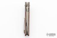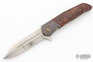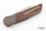 This Athena Flipper by Bob Terzuola features a bead blast finished blade with a notched thumbrest and a flipper. The handle has timascus bolsters, burlwood scales with red linen micarta bands, orange peel finish titanium liners, with timascus backspacer, and a tip up titanium clip with hidden screws. Smooth action. Nice blade seating, detent and lockup. Excellent condition. Comes with a zippered case.