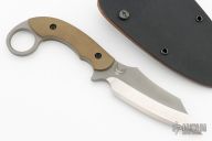 This KaramBat is inspired by the traditional Karambit style fighting knife. This knife has an S30V stainless steel blade sharpened to 18.5 degrees.  .189" Blade Stock.  1.417" Blade Depth. The handles are 3D contoured radial high cut pattern anodized titanium scales. Includes a leather lined, black kydex sheath and COA. New from maker!