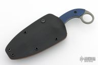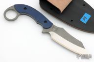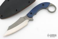 This KaramBat is inspired by the traditional Karambit style fighting knife. This knife has an S30V stainless steel blade sharpened to 18.5 degrees.  .189" Blade Stock.  1.417" Blade Depth. The handles are 3D contoured rain drop pattern anodized titanium scales. Includes a leather lined, black kydex sheath and COA. New from maker!