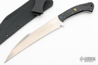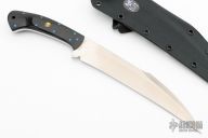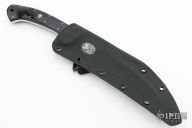The Punisher Guinuting Philipino Marine Sword by Micky Yurco, features a wharncliffe/hawkbill style blade with a sharpened top edge, full tang construction, .179" Blade Stock 1.433" Blade Depth. The handle is composed of black G10 scales with blue G-10 pins. Comes with a kydex sheath with belt clip. New from maker at the 2023 Blade Show.