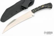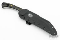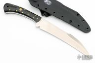 The Punisher Guinuting Philipino Marine Sword by Micky Yurco, features a wharncliffe/hawkbill style blade with a sharpened top edge, full tang construction, .188" Blade Stock 1.231" Blade Depth. The handle is composed of black G10 scales with yellow G-10 pins. Comes with a kydex sheath with belt clip. New from maker at the 2023 Blade Show.