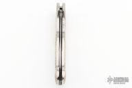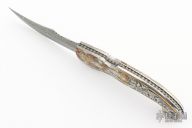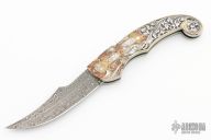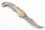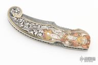 This auto by the Late Joe Kious features a Damascus blade with false top edge and fileworked blade spine. The handle has a stainless steel frame that has been engraved with gold and copper inlays by Jon Robyn, fileworked Damascus backspacer. Has gold inlays and beautiful engraving. Excellent condition. Stunning piece, amazing attention to detail. Nice action and lockup.