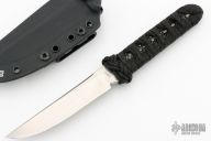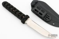 This Tanto by Mickey Yurco features a satin finished blade with .139" blade thickness and 1.001" blade depth. The handle has black cord wrap over rainbow rayskin. Comes with a kydex sheath. New from maker at the 2023 Blade Show.