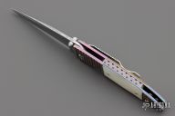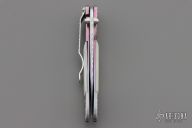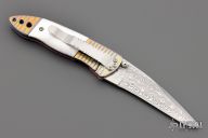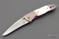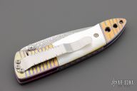 This Janus linerlock folder from Crawford knives features a Damascus blade with a false top edge and dual thumbstuds. The handle has a jeweled, milled and anodized titanium frame, mother of pearl scales, fileworked Damascus backspacer, tip down fileworked stainless steel clip. Smooth action with a nice blade seating and lockup. Has some light scratches, otherwise excellent condition.