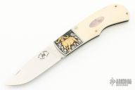 This lockback by Steve Hoel features a hand rub satin finished clip point blade with nail nick. The handle has engraved stainless steel bolsters with gold inlays and integral liners, fossil walrus ivory scales with black lip pearl inlays. Nice lockup and blade seating. Very nice seamless inlays. The engraving was done by RE Skaggs. Excellent condition.  "06" on the blade.