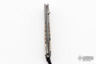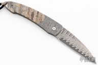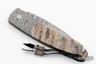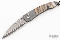 This B10 DMD Catalina button lock folder by William Henry Knives features a ZDP-189 "wave" Damascus blade with a single thumbstud with a white topaz inlay. The handle has a carbon ladder Damascus frame with Fossil Mammoth Tooth scales with black liners, push button with white topaz inlay, lanyard bail with sterling silver bail and beads. Includes original box, sheath and certificate of authenticity dated December 13, 2006. Excellent condition.