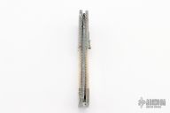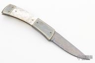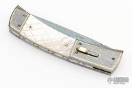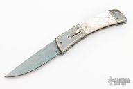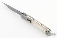 This Automatic Folder from Jerry Corbit features a mosaic Damascus drop point blade. The handle is comprised of Mosiac Damascus double bolsters and push button with gold inlay and checkered mother of pearl scales over fileworked and jeweled titanium liners and fileworked stainless steel backspacer with mother of pearl insets. Has some light scratches, otherwise excellent condition.