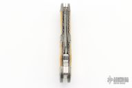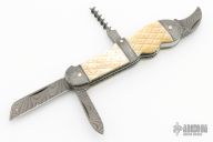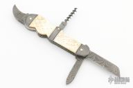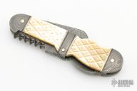This Bartender's Knife by Joel Chamblin features Damascus blades with nail nicks, Damascus cork screw. The handle has fluted Damascus bolsters, checkered mother of pearl covers with gold pins, fileworked integral Damascus liners, stainless steel springs. Has half-stops. Excellent condition. Stunning peice.