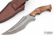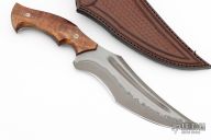 Another gorgeous piece from the Sobral Brothers! This Caiman knife features San Mai steel with false top edge, fullers, .209" blade stock and 2.045" blade depth. Full tang construction. The handle features koa wood scales. Comes with gorgeous custom leather sheath, and leather zipper case. New from maker!