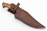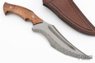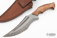 Another gorgeous piece from the Sobral Brothers! This Caiman knife features San Mai steel with false top edge, fullers, .216" blade stock and 2.045" blade depth. Full tapered tang construction. The handle features koa wood scales. Comes with gorgeous custom leather sheath, and leather zipper case. New from maker!