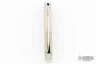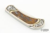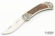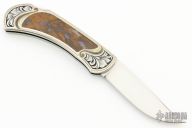 This lockback folder by Buster Warenski features a hand rub satin finished blade with a single nail nick. The handle has an engraved stainless steel frame with gold inlays, has agate stone inlays, stainless steel backspacer. Excellent condition. Comes with a zippered pouch. Engraved by Julie Warenski.