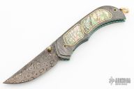 This knife by Matthew Lerch features a Damascus blade with false top edge, fileworked spine, brass thumbstud with abalone inlay. The handle has Damascus scales with abalone inlays and gold engraved inlays, fileworked Damascus backspacer with copper inlays, anodized and fileworked titanium liners, gold lanyard bail. Has a hidden button release on the front forward abalone inlay, when in auto mode, this fires the knife. To turn in into California opening mode, take a credit card and press down on the leading edge of the backspacer at the butt of the knife, then close the knife, now it is a California open. To turn it back to auto mode, take a credit card and press down on his logo on the spring. Comes with a zippered case. Nice detent, lockup and blade seating. Excellent condition.
