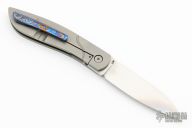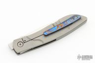 This Scylla by Stephane Espi features a hand rub satin finished drop point blade with front flipper tab. The handle has a bead blasted titanium frame, and tip up Zircuti clip. Nice detent, lockup and blade seating. Comes with zipper case and COA. New from maker at the 2023 Bladeshow!