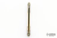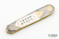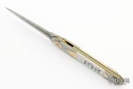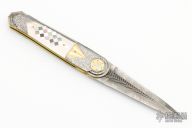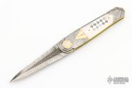 This Art Deco Linerlock Folder by Owen Wood features a multi-bar Damascus blade with false top edge. The handle has Damascus bolsters, gold pivot with black lip pearl inlay, two-tone gold inlays on bolsters, mirror polished stainless steel scales with black and mother of pearl inlays, gold spacers, anodized titanium liners, two-tone blued steel backspacer. Comes with a zippered case. Excellent condition.
