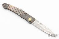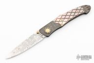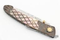 This Lockback by Howard Hitchmough features a Damasteel spear point blade with a gold thumbstud and fileworked spine. The handle has a Damascus frame with fluted butt, blued steel pivot collars with 18k gold inlays and 18k gold pivot, checkered black lip pearl inlays with 18k gold screws, Damasteel fileworked lock release and a blued steel backspace with 18k gold pin inlays. Nice lockup and blade seating. Comes with a Velcro case. Excellent condition.