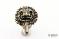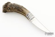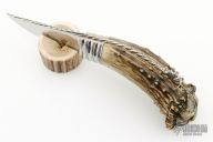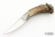 This Goblin by Jim Schmidt features a mirror polished blade with fileworked spine. The handle has fluted stainless steel bolsters, crown stag scales, brass liners, fileworked steel backspacer/lock release. The butt of the knife has Jim's famous Goblin face carved into the butt. It is signed and dated #3 1979. Comes with a zippered case. Excellent condition.
