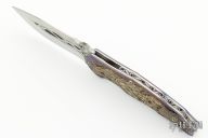 "Creating a knife by hand is what I consider a real art form. The passion for the cutting tools has always been in me and has grown with me until the decision to build my first knife alone. I started at 40, in 2003, practically self-taught, I had no experience of manual work, but I had done for many years the mechanical designer and this allowed me to know perfectly the technique and all the various stages of mechanical processing. Currently I am a member of The Italian Knife Guild, with a rank of Maestro. What I do now is what I consider my art form, creating "craft, hunting and collectible knives". They are knives made entirely by hand, only with an infinite series of files, a small drill for the holes and a sander for the concave grinding of the blades, nothing else. I create especially folding knives, which satisfy more my desire to build perfect mechanical objects and precisely the perfection in the smallest details, even inside where you can not see. Of course with the passing of the years I have refined my technique and currently I have improved even more. The mechanism inserting on the blade rotation a system of ball bearings, which guarantee an absolutely perfect seal and allow the blade to close and open without the least friction and with an incredible sweetness. With regard to the blades then, I'm experimenting with new types of hardening, which give hardness of 62-63 HRC and allow a thread seal and exceptional cutting quality for all types of use. I realize virtually all the knives on my initial design, they are all unique pieces made entirely by hand up into the smallest details, one at a time, so that, in my opinion, a knife can be considered "handmade". For the blades I prefer RWL34 steel which is sintered by powders and guarantees the total absence of internal defects, I sometimes use even the damask, both stainless and carbon. For the handles, one of the most beautiful materials is the mammoth tooth, which can be found in a variety of colors all beautiful, I also use the fossil ivory of mammoths, various roots, titanium and carbon fiber. Most of the knives, however, 'I do it completely in steel, to be able to then be engraved, always and strictly by hand, to transform even more' knife, into a real work of art ..."