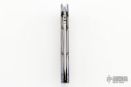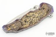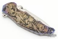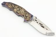 This linerlock flipper by Sergio Consoli features a hand rub satin finished blade with engraved flats, notched flipper. The handle has anodized and engraved titanium scales, Inox steel liners, engraved stainless steel backspacer. Sergio's ball bearing system gives the knife an effortless flip that requires no wrist action. Nice lockup, detent and blade seating. Outstanding work. Excellent condition. Comes with zippered case and COA dated February 2022.