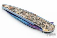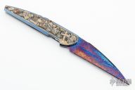 This linerlock flipper by Sergio Consoli features a Bertie Rietveld Dragonskin Damascus blade with notched flipper. The handle has anodized and engraved titanium scales with gold and copper inlays, Inox steel liners, engraved and anodized titanium backspacer. Sergio's ball bearing system gives the knife an effortless flip that requires no wrist action. Nice lockup, detent and blade seating. Outstanding work. Excellent condition. Comes with zippered case and COA dated November 2021. Engraved by Elena Bosio