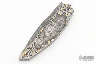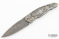 This linerlock flipper by Sergio Consoli features a "Reptilian" Stainless Damascus blade with notched flipper. The handle has engraved stainless steel scales with gold inlays, Inox steel liners, engraved stainless steel backspacer. Sergio's ball bearing system gives the knife an effortless flip that requires no wrist action. Nice lockup, detent and blade seating. Outstanding work. Excellent condition. Comes with zippered case and COA dated October 2021. Engraved by Fabio Bregoli