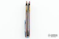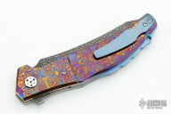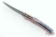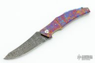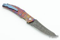 This linerlock flipper by Sergio Consoli features a Spirograph Stainless Damascus blade with notched flipper. The handle has timascus scales, Inox steel liners, anodized titanium backspacer and tip up clip. Sergio's ball bearing system gives the knife an effortless flip that requires no wrist action. Nice lockup, detent and blade seating. Outstanding work. Excellent condition. Comes with zippered case and COA dated January 2019.