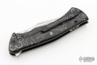 This S5 "Southern Star" is an impressive collaborative knife design from Zieba Knives and Jason Knight. Its rounded titanium frame lock handle is contoured for comfortable use, and has a laser engraved finish. The knife sports a unique harpoon style recurve Damasteel blade with stylized grooves and a flipper tab. The knife comes complete with a machined titanium pocket clip for secure tip-up carry. Titanium handle construction provides a durable, lightweight frame. Steel lock bar insert for secure over-travel protection. Ceramic ball-bearing pivot makes blade deployment a snap. Comes with zippered and card. Excellent condition.
