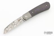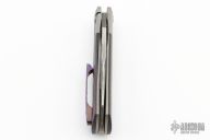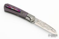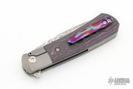 This Apache Flipper was designed by Enrique Pena, manufactured by Reate Knives and features Lee Williams Kickstop.  This knife features a Damasteel blade with notched thumbrest and flipper tab.  The handle has titanium bolsters, purple haze carbon fiber scales with a titanium backspacer and a titanium tip up Timascus pocket clip.  The knife opens with the use of Lee Williams' Kick Stop flipper. Excellent condition.