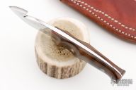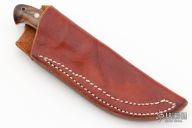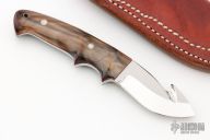 This Loveless Style Improved Handle Guthook Skinner by Kunihiko Tamatsu features a mirror polished blade with guthook, .140" blade stock and .777" blade depth, full tapered tang construction. The handle has sheep horn scales with red liners. Excellent condition. Beautifully crafted. Comes with brown leather sheath.