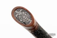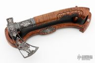 This Axe by Csaba Vojko features a hand carved axe head with a hammer pole, 2.75" blade and 6.75" from blade to pole. The handle has a carved wood grip with engraved steel fittings. The display stand is equally impressive. It is made of hand carved stainless steel and wood. Very cool. Excellent condition.