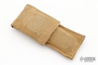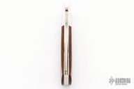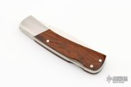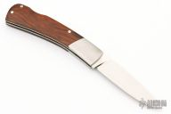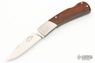 This Lockback folder by Jack Busfield features a hand rub satin finished drop point blade with nail nick. The handle has dovetailed stainless steel bolsters and liners, desert ironwood scales, steel lockbar and backspacers. Has some light scratches, otherwise excellent condition. Comes with a felt pouch.