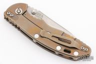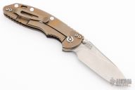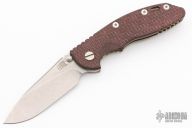 This XM-18 Slicer by Rick Hinderer Knives features a 3.5" stonewash finished blade, notched thumbrest and dual thumbstuds. The handle has a maroon micarta scale, and stonewashed and anodize finish titanium handle/clip. Clip can be mounted for tip up or down carry. Tri-way pivot system. Has a couple light scratches, excellent condition otherwise.