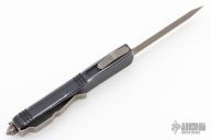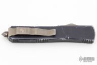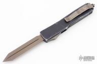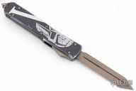 This knife by Microtech is a Molon Labe Spartan Ultratech, it has a bronze apocalyptic standard blade with fullers and double edged. The handle is black aluminum with bronzed hardware and stainless steel clip and glass breaker. Has Spartan Helmet Logo on handle, handle has been distressed. Comes with original box and papers. 11/2016. Excellent condition.