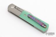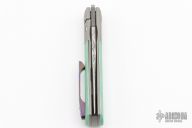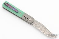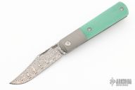 This Barlow Front Flipper by Enrique Pena features a Damasteel blade with a front flipper and notched thumbrest. The handle has titanium bolsters, micarta scales (custom made by Pena) with a titanium backspacer and Timascus tip up pocket clip. Excellent condition.