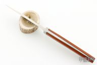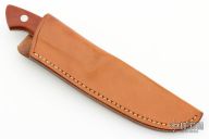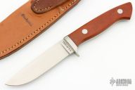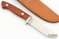 This Hunter by Richard Bridwell features a hand rub satin finished blade with .183" blade stock and 1.006" blade depth, full tapered tang construction. The handle has a stainless steel guard, wood scales and black liners. Comes with a brown leather sheath. Has a couple light scratches, otherwise excellent condition.