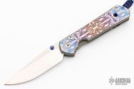 This Large Sebenza 21 CGG "The 60s Pattern", by Chris Reeve Knives features a stonewashed blade with single titanium thumbstud, notched thumbrest. The frame is bead blasted titanium with matching tip up clip; the front scale is satin finished with the computer generated graphic. Nice detent, lockup and blade seating. Has a couple light scuffs and scratches, otherwise excellent condition.