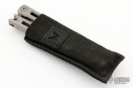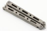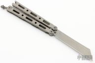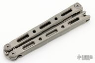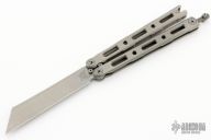 This Model 87 Balisong by Benchmade features a tumble finished wharncliffe style blade. The handle is comprised of an integrally constructed, skeletonized titanium frame with bead blast finish. Spring-loaded T latch on pommel. Comes with original box, sheath and papers. Excellent condition.
