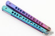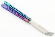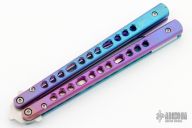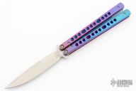 This Model 62 Balisong by Benchmade features a stonewashed spear point D2 blade with a false top edge. The handle has Flytanium anodized titanium handles, comes with latch, but it has been removed. Comes with original sheath and box. Excellent condition.