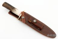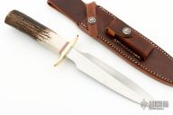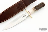 This Model 2-7 Dagger by Randall Made Knives features a double-edged satin finished blade with .210" stock and 1.319" blade depth, hidden tang construction. The handle has a brass guard with red/white/blue spacers and a stag grip. Comes with a brown leather sheath and original paper wrapping.  New from maker.
