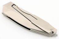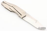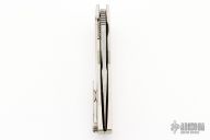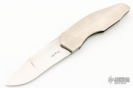 This Enigma by GTC features a hand rub satin finished multi-ground blade with notched thumbrest and Gus's proprietary flipper. The handle has textured faux bolsters on its hand rub satin finished titanium frame with tip up clip. Rides on bearings, nice detent, lockup and blade seating. This knife has a unique take down mechanism. Unscrew the clip to disassemble the knife. Check out his instagram to see how it works! Comes with zippered case and COA. Dated 2023. Has some scratches, otherwise excellent condition.