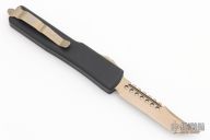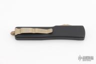 This UTX-70 OTF automatic by Microtech features a stonewash bronzed finished blade with a standard edge. The handle has a black aluminum frame with blasted stainless steel tip down clip. Dated 07/2018. Comes with original box and papers. Excellent condition.