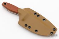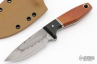This knife by Bradshaw Blades features a hand rub satin finished blade with nice clay tempered hamon, .153" blade stock and 1.182" blade depth, full tang construction. The handle has black canvas micarta bolsters, natural canvas micarta scales with black G-10 liners and white/green G-10 spacers. Comes with a kydex sheath. Excellent condition.