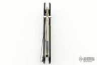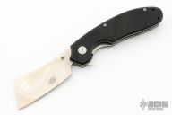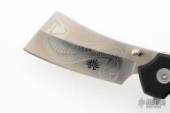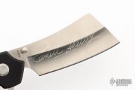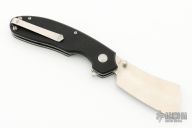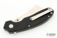 This knife features a satin finished cleaver style blade with a notched thumbrest and dual thumb studs. The handle has black G-10 scales over steel liners with a matching tip up pocket clip. Includes the original box. Excellent Condition.