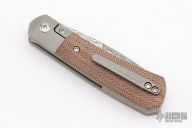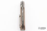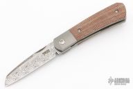 This Apache Front Flipper was designed by Enrique Pena, manufactured by Reate Knives and features Lee Williams Kickstop.  This knife features a Loki Damasteel blade with notched thumbrest and flipper tab.  The handle has bead blasted titanium bolsters, natural canvas micarta scales with a titanium backspacer and a bead blasted titanium tip up pocket clip. Includes original box. Excellent condition.