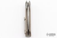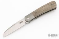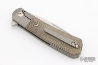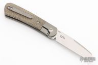 This Apache Front Flipper was designed by Enrique Pena, manufactured by Reate Knives and features Lee Williams Kickstop.  This knife features a satin finished blade with notched thumbrest and flipper tab.  The handle has titanium bolsters, green micarta scales with a titanium backspacer and a titanium tip up pocket clip.  The knife opens with the use of Lee Williams' Kick Stop flipper.  Includes a Pena X-Series padded box. Excellent condition.